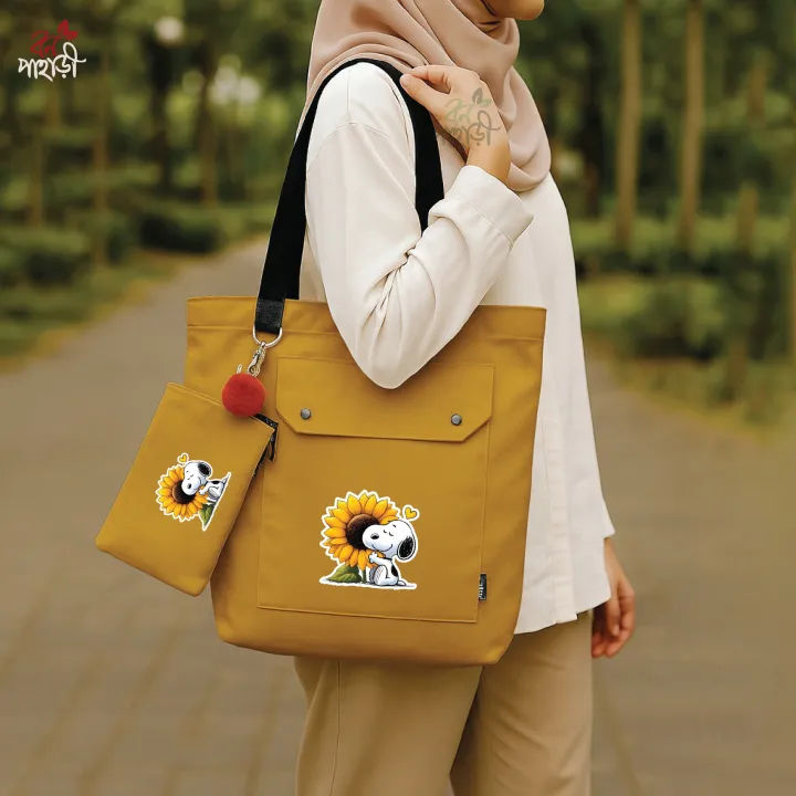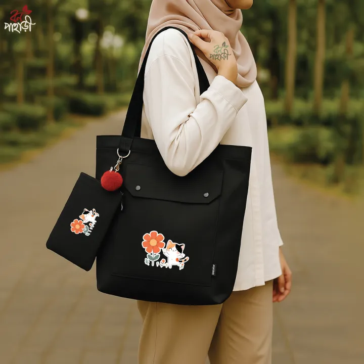 Products Details Of Trendy Top Handle Tote DTF Canvas Bag, Black Color Canvas Fabric and Shopping Bag / College / University Bag, Tote Bag, Canvas Bag with DTF Pouch/Pencil Bag/Cosmetic Bag.